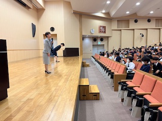今年も日本大学藤沢中学校様にて 今年も日本大学藤沢中学校様にて 広大な敷地の中学校で、生徒さんは伸び伸びとしながらも挨拶をしっかりできる方もたくさんいらっしゃいました。 毎年ご依頼いただいており、大講堂で中学生に何をどう教えたら良いかを工夫しております。昼食後の眠くなりやすい時間帯ですので、刺激的に楽しく伝えたいと心がけています。 生徒さんから「理由がわかって、とても良かった」や「楽しかった」と感想をおっしゃっていただきました。ジュニアマナーズ協会は、この感想が何よりのやりがいとしております。