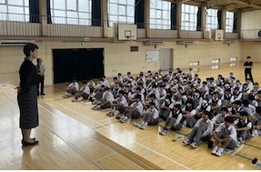 足立区立蒲原中学校様には、何度も伺わせていただいております。生徒数が多い学校ですが、講師が3名で参りますので、全員に漏らさずきちっと指導をして参ります。写真は、「いすに座った時のマナー違反を探そう」というマナークイズを出題している時の1シーンです。机の上にバッグを置いている、いすに座ったまま目上の人に挨拶している、いすを机に出し入れする時に床をする、席から離れるときに椅子を仕舞い忘れているなど、基本的なところも確認しなおしていただいています。